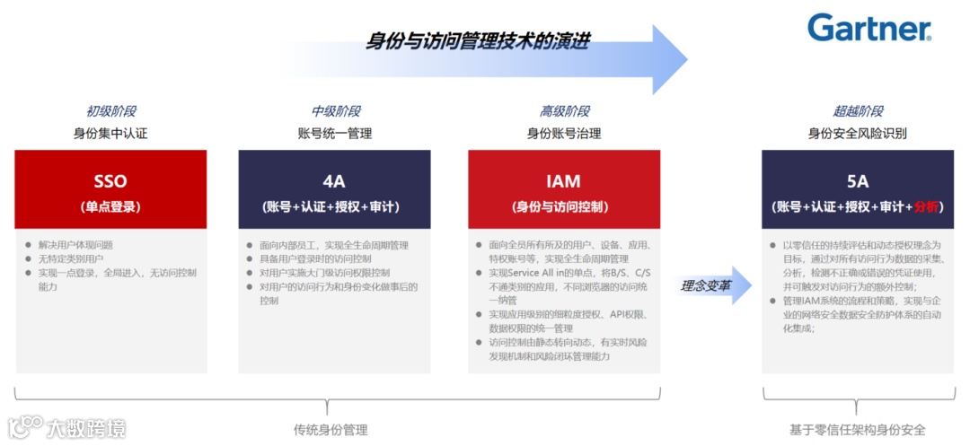 在产品功能上,派拉软件IAM产品具备了更加丰富和先进的产品功能与能力。根据Gartner发布的身份与访问管理技术演进图,派拉软件已经走到了超越阶段——身份安全风险识别,并提供完整的八大服务能力。