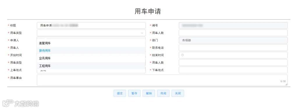 2、自定义配置审批流程:依据不同类型的车辆,将用车审批流程和权限做了对应区分。如接待用车可由销售、市场、总经办等相关业务部门提出申请,由直属主管、行政部和分管总助审核,工程用车则只能由工程部提交申请,由工程部经理和分管副总审核。涉及不同类型车辆做调剂借用的,如借用高管用车做商务接待,审批流程和权限也要做相应调整。