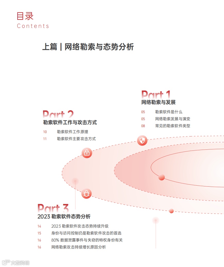 报告中详细综述了勒索软件,帮助全面了解勒索软件的定义、发展与演变、常见类型、工作原理和主要攻击方式等内容;并从身份与访问控制的维度,分析了2023年网络勒索态势。最后,结合新技术,从身份与访问控制的角度详细阐述如何应对和防御网络勒索。