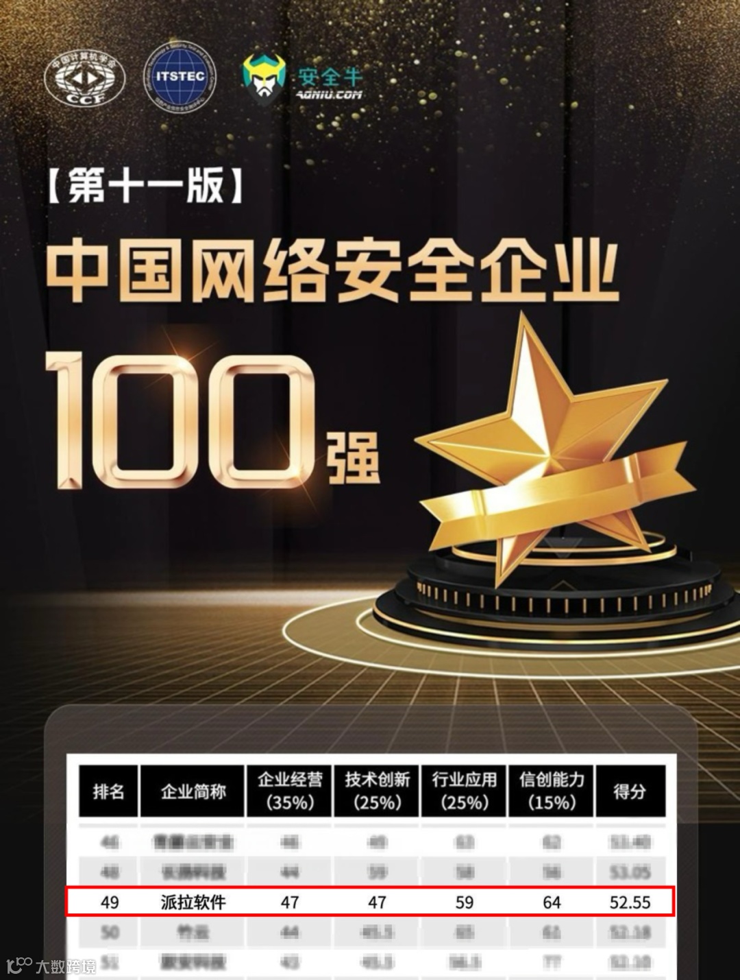 近日,第十一版《中国网络安全企业100强》正式发布。派拉软件蝉联上榜,凭借在企业经营、技术创新、行业应用、信创能力四大维度的综合表现与落地成果,在申报的300余家安全厂商中脱颖而出,获评《中国网络安全企业100强》综合能力100强,位列第49名。