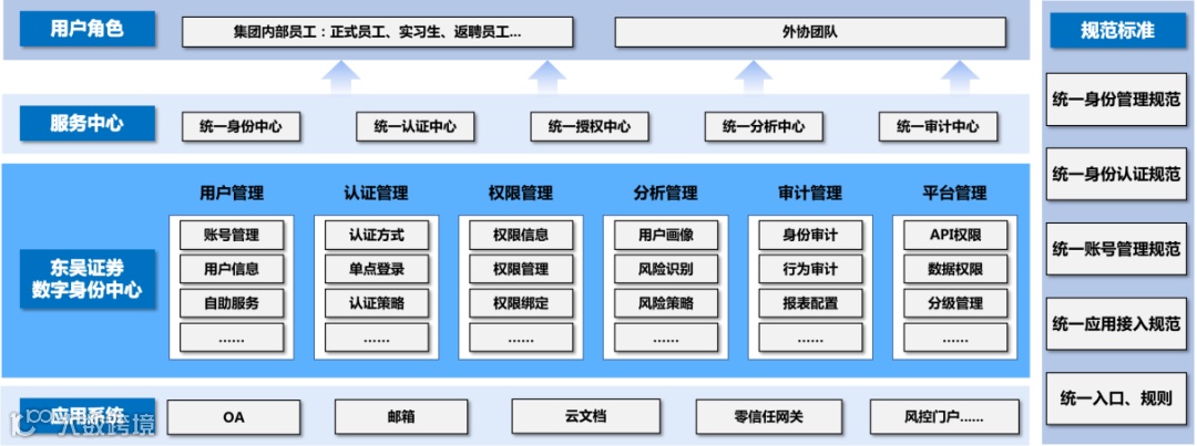 东吴证券数字身份中心一方面考虑到传统身份管理中统一认证、单点登录等基础应用场景,另一方面也兼顾了零信任架构中增强型身份管理对身份风险分析的要求。