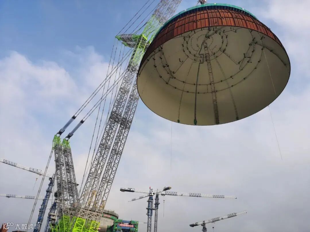 内穹顶吊装是华龙一号核电工程建设的重要里程碑。穹顶位于核岛顶部,主要功能是保证反应堆厂房完整性和密封性,对放射性包容起关键性作用。吊装当天,随着总指挥一声令下,内穹顶被缓缓吊离地面,经过起钩、变幅、提升、带载行走、大臂逆时针回转等一系列高精度动作,精准直达漳州核电2号机组反应堆厂房上方,随后缓慢下降,经调整无误后,平稳落钩就位在安全壳钢衬里上。