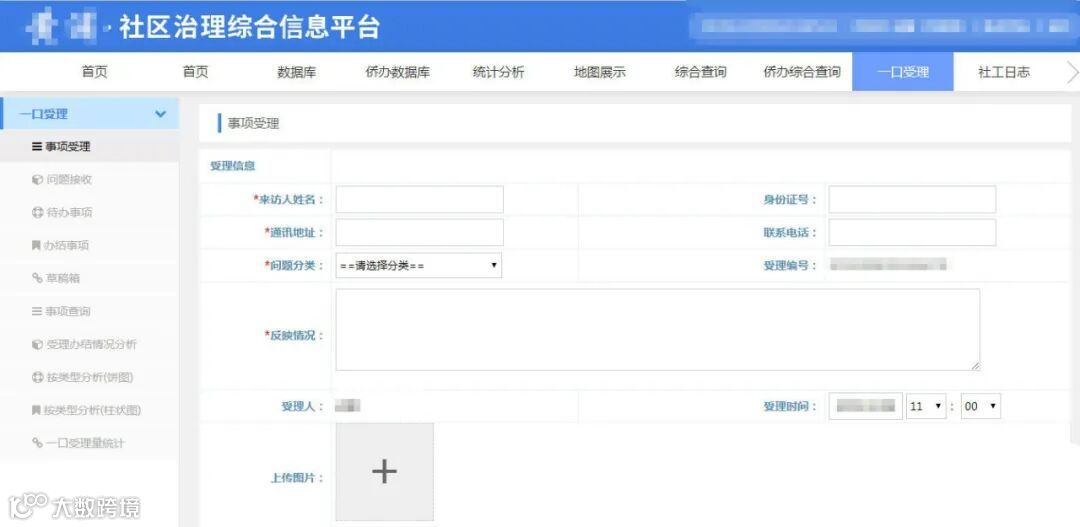 设置“政策查询”功能,可按照关键字查询各类政策和办事指南,方便社工在走访中解答居民问题。设立了问题受理模块,在走访过程中,可以将问题分类进行受理。受理问题不能当场办结的转入待办问题。可将特定家庭、特定人员的走访任务派单给特定社工。社工在走访过程中,如发现实际基本信息或标签信息与系统显示不符,可进行信息纠正上报,信息上报后由专职人员进行审核,统一修改。