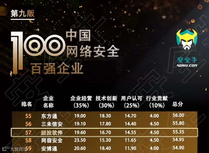 近日,国内第三方安全咨询机构安全牛正式发布《中国网络安全企业100强》(第九版)。本次榜单的评选,细分出基础安全、业务与应用安全、身份与访问安全、数据安全等多个细分领域,从营收占比、用户数量、产品成熟度等角度,对细分领域中有较突出表现的企业进行了收录。派拉软件再次入选榜单百强及身份与访问安全细分领域。