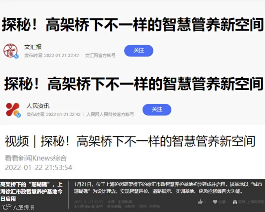 近日,位于沪闵高架桥下的徐汇市政智慧养护基地初步建成并启用,这是上海市道路运输行业优化提升桥荫桥孔空间、推进道路养护数字化转型的又一成果。文汇报、人民资讯、上视新闻综合、澎湃新闻等多家媒体均有相关报导。