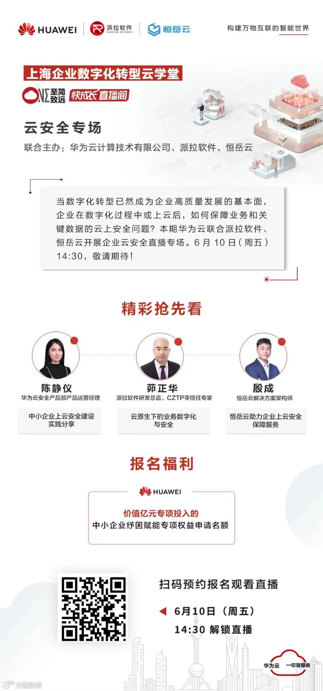 那么,在企业云上数字化发展进程中,企业面临着哪些挑战?如何保障业务和关键数据的云上安全问题?2022年6月10日 14:30,由派拉软件联同华为云、恒岳云开展企业云安全直播专场,精彩内容敬请期待!
