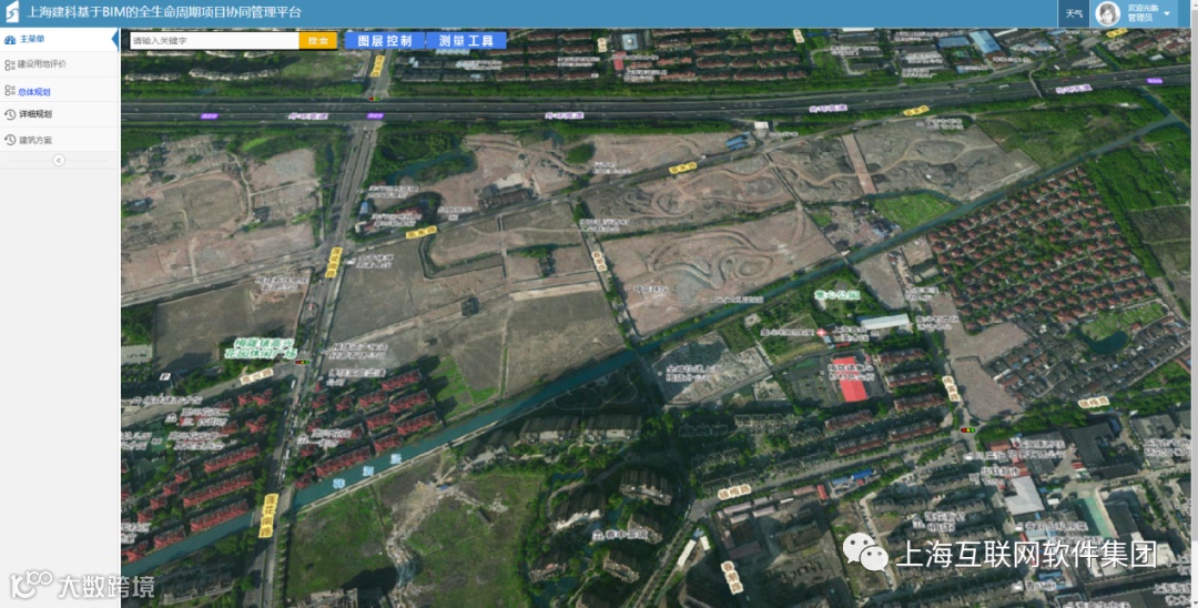 用户可以使用GIS+BIM模型(外立面)的加载方式实现对园区整体环境的浏览;可按BIM模型、周边环境、用地性质进行图层显隐;可进行测距,面积测量;可通过搜索快速定位至相关地块、相关建筑。