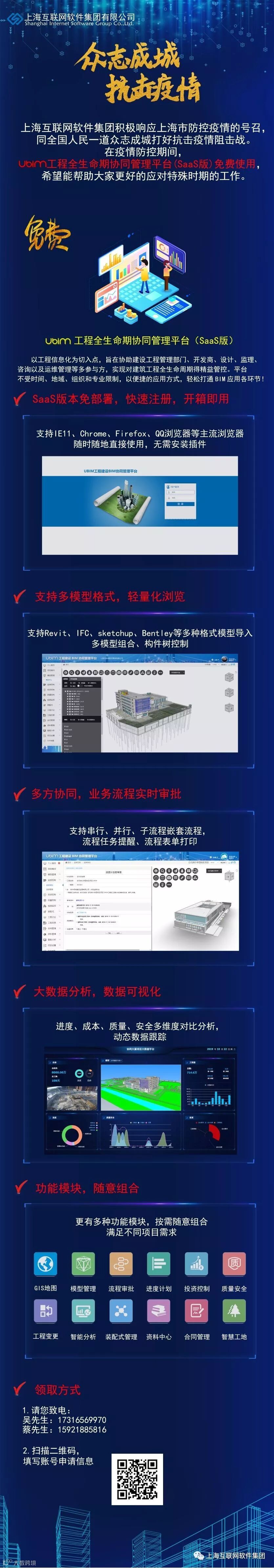 新冠肺炎疫情发生后,互软集团响应号召,积极投身于疫情防控系统建设中。继“互软UMIS协同管理平台SaaS版(Uffice®7 协作办公云平台)”防疫期间被上海市经信委征集为免费向社会开放的协同办公云服务产品后,互软集团再次重磅出击:疫情期间,互软UBIM工程全生命期协同管理平台SaaS版为工程建设者免费开放使用权限,直至疫情解除。长按下图二维码即可领取: