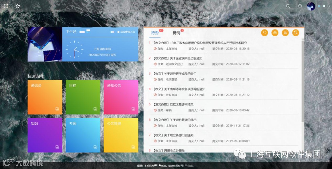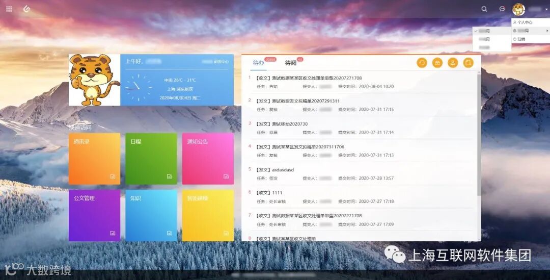门户首页上集成各种应用呈现效果,包括权限菜单展示、统一查询、统一待办任务、个人中心等。应用中心可链接本地应用,无需离开门户就能一键打开桌面应用,方便用户使用,提高办公效率。