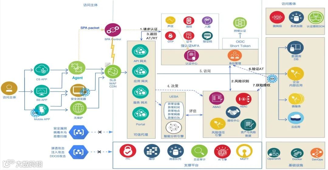 另一方面是业务端的访问安全,传统基于RBAC(角色授权)的授权模式是静态的,这种授权机制导致发生权限变化无法及时调整,同时RBAC无法控制基于同一角色下不同属性权限的区分;另外,业务访问时需要先进入资源环境才可验证是否有访问权限,也将面临IP地址提前暴露风险;