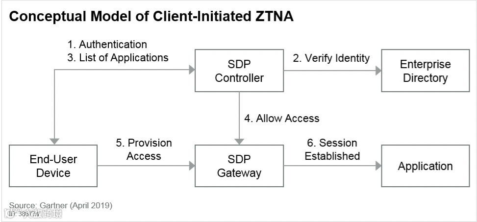 我们再来看一下ABAC访问控制模型和零信任架构的结合点,从Gartner提供的报告中,我们可以看到典型的零信任架构图如下: