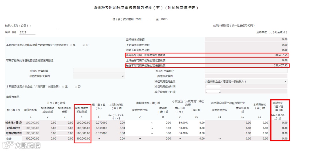 ►2、确认“当期新增可用于扣除的留抵退税额”是否为上期申请的留抵税额(小编选取的企业,4月申请的留抵税额为388407.55元,5月需缴100000元增值税,以上数据均为系统自动带出)