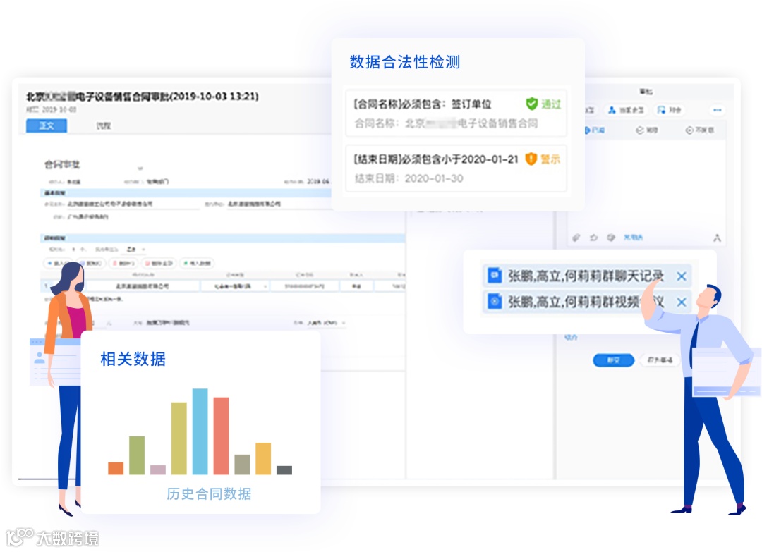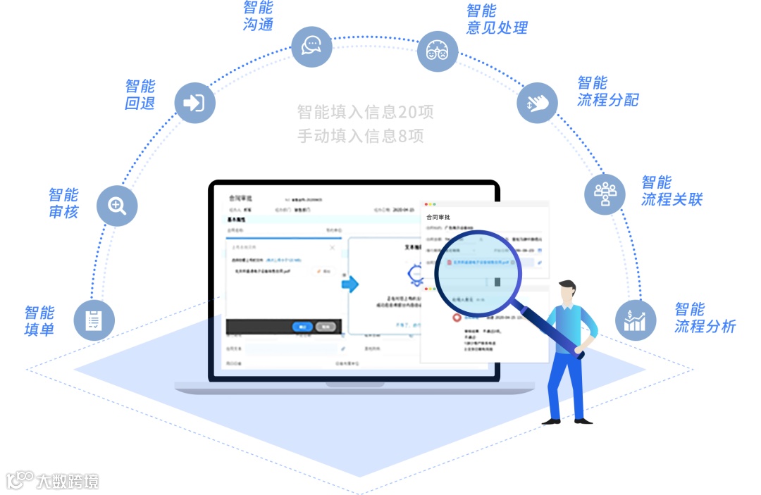 销售员小郑近期签约了一家新客户,借助A8+ V8.0协同运营平台,小郑体验了更智能化的合同审批流程:他只需要上传合同电子文档,系统基于NLP文本抽取技术实现智能填单,流程机器人快速完成智能审批,小郑还可以就细节与领导、审批人快捷沟通;合同审批结束后,系统还自动触发新业务流程。