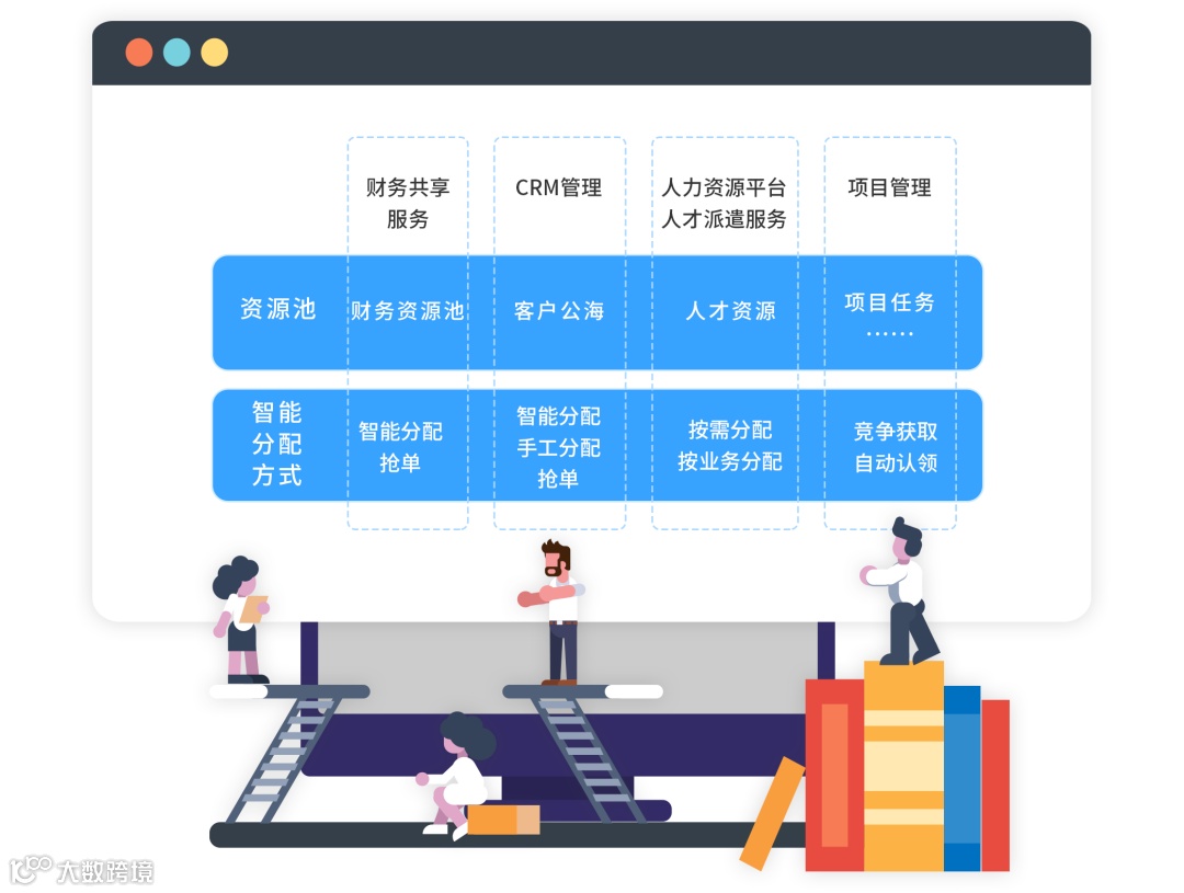 为帮助企业突破现有资源限制,实现集团整体资源的有效合理分配,以效益最大化为目标,以智能化分配方式,为企业提供实现资源共享的过程和方法,内容包含但不限于原料、设备、劳动等一般资产为对象的共享及配置, 分配方式包括自动分配、人工分配、抢单三种模式。