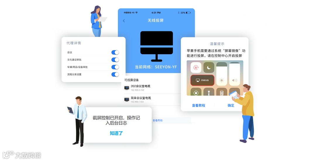在移动体验方面,还提供了全场景的移动办公、移动业务、移动集成能力,比如无线投屏、无线打印、文件管理、防截屏能力、代理人设置、支持暗黑模式等,让移动端的办公体验性和安全性大大加强。