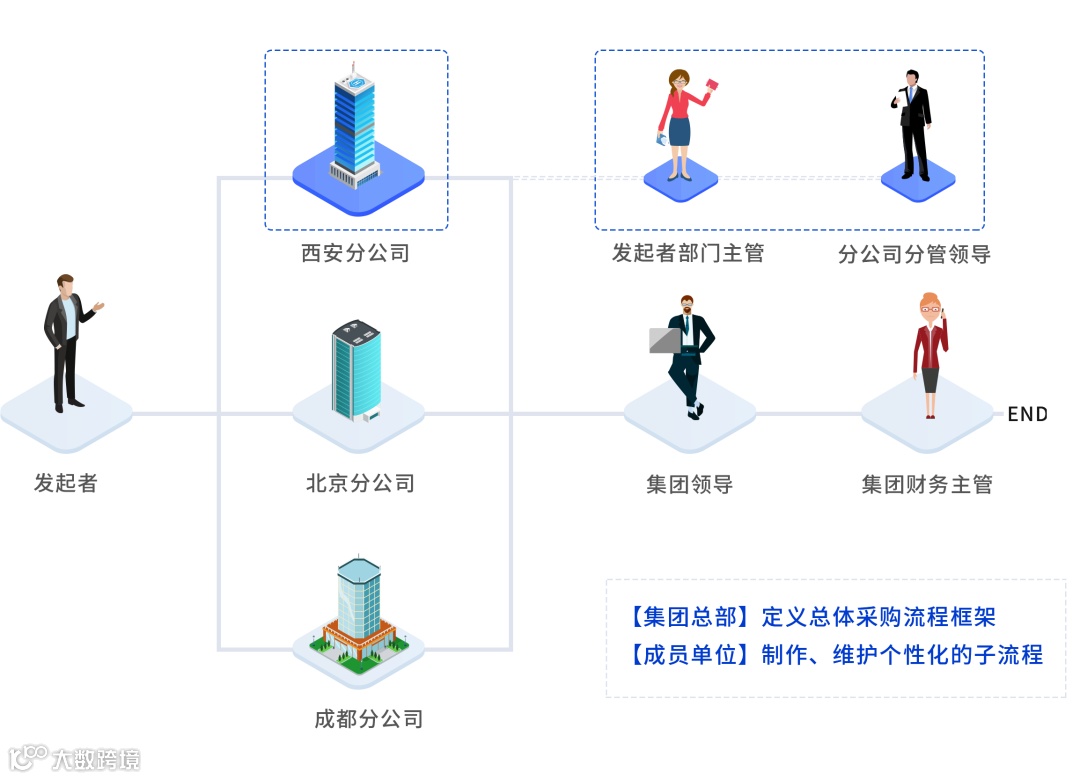 企业A是一家集团性公司,全国各地有十几家分子单位,针对通用的物资、服务等需求,需要集团进行集中采购,但又要针对分子单位不同的层级特点、个性需求进行区别的流程设计。