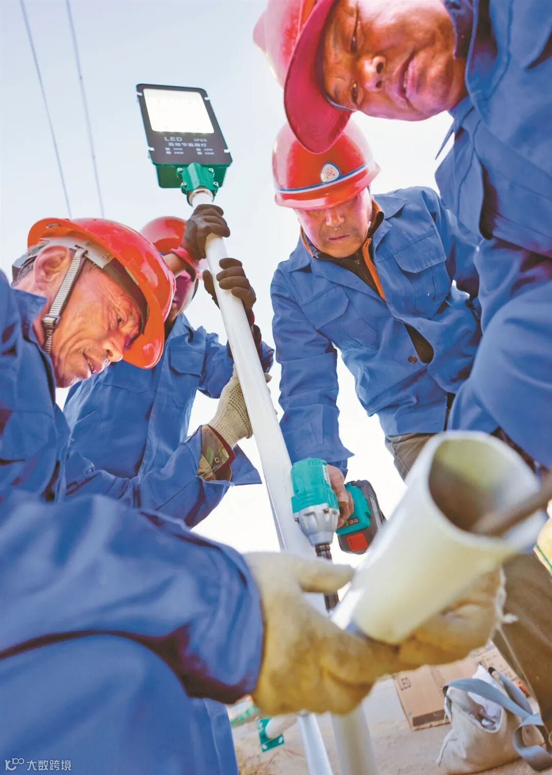 国家电投积极助力乡村振兴。图为在下营子村,施工人员进行安装路灯前的准备工作。人民日报记者 李舸 摄