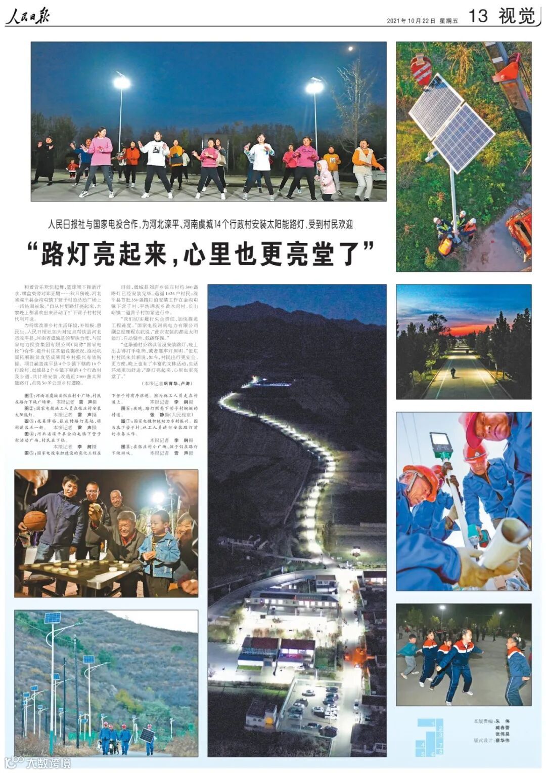为持续改善乡村生活环境,补短板、惠民生,人民日报社加大对定点帮扶县河北省滦平县、河南省虞城县的帮扶力度,与国家电力投资集团有限公司(简称“国家电投”)合作,提升村庄基础设施状况,推动巩固拓展脱贫攻坚成果同乡村振兴有效衔接。项目涵盖滦平县4个乡镇下辖的10个行政村、虞城县2个乡镇下辖的4个行政村及乡道,共计将安装、改造近2000盏太阳能路灯,点亮50多公里乡村道路。