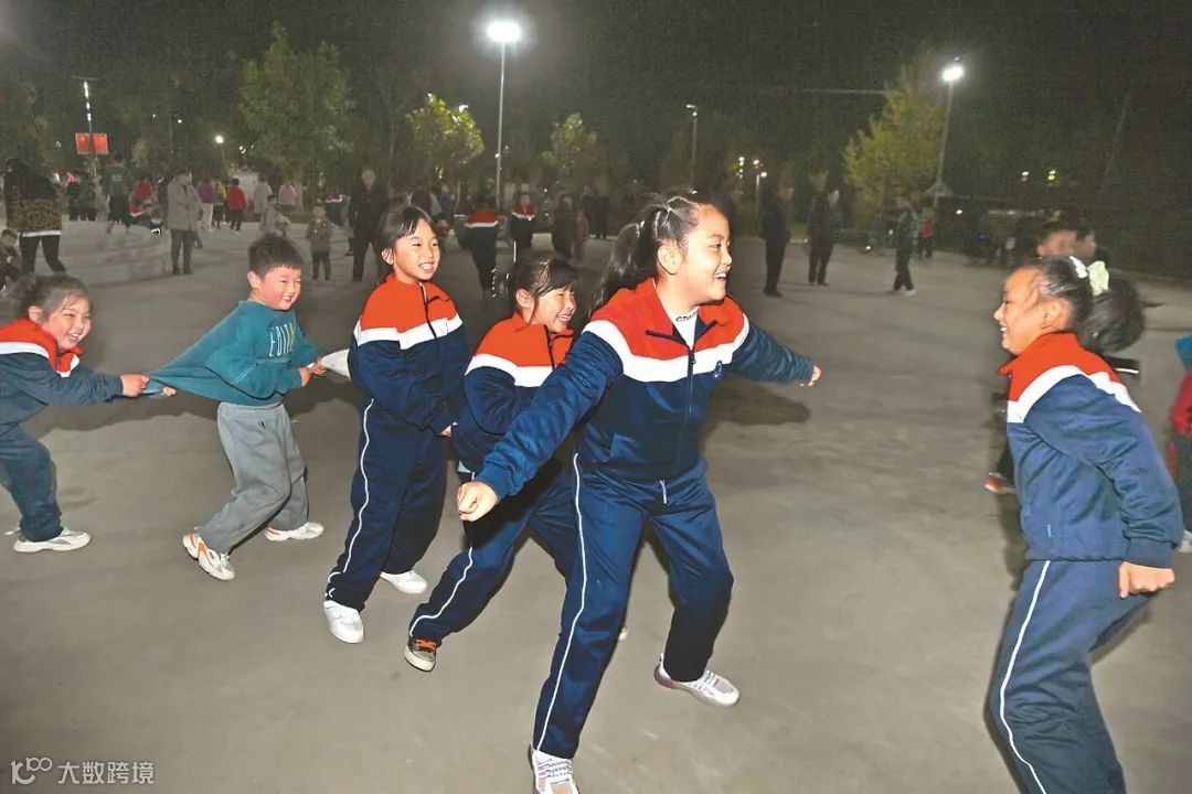 在张庄村小广场,孩子们在路灯下做游戏。人民日报记者 雷声 摄