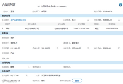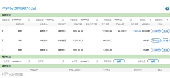 收款合同执行过程中,销售人员发起回款信息,财务确认后自动更新合同回款情况。点击详情、查看按键,可查看相关到款详细信息与发票开票记录。
