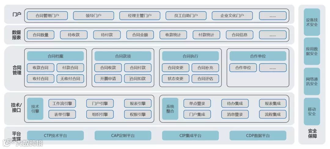 以合同的信息管理和收付款管理为核心,包含合同审批、收款、付款、扣款、开票、变更、补充、状态变更与评估等功能,覆盖合同从签订、履行到履约结束的全生命周期。
