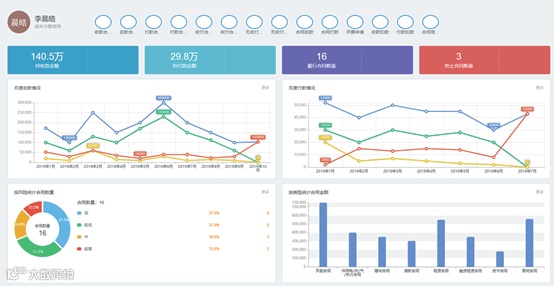所有合同数据自动汇总成合同管理空间,显示出应收、应付费用,合同执行情况。并从多个维度对合同执行情况进行分析。