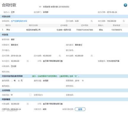 付款合同执行过程中,可与企业预算关联,付款审批过程中可查看历史付款记录,为领导审批提供依据。