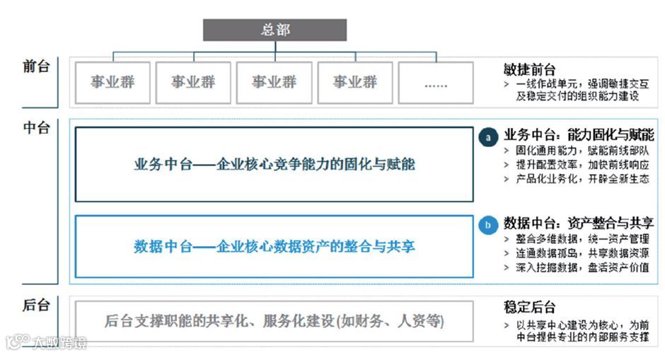 “中台”概念起源于军事范畴,目前已逐步成为领先企业的共同选择。近三年来,代表性的互联网巨头相继按“小前台,大中台”的模式进行组织调整;事实上,一些传统领域的领导企业亦陆续向打造具有自身特色的中台组织方向演进。