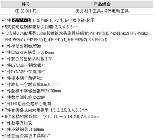第一款,史丹利STANLEY CD-83-011-TC 42件多用工具组套,除了包含扳手、钳子、螺丝批等常用工具外,还有10.8V充电式电钻/起子,为安装、打孔等工作省力提效;测电笔及万用表等电工工具,用于线路检测。