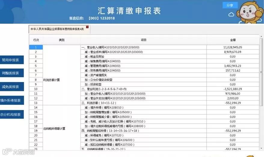 4、 点击【确定】按钮后,进入所得税纳税申报表A类主表界面,报表直接从T3软件中取数,免去手工计算的过程。
