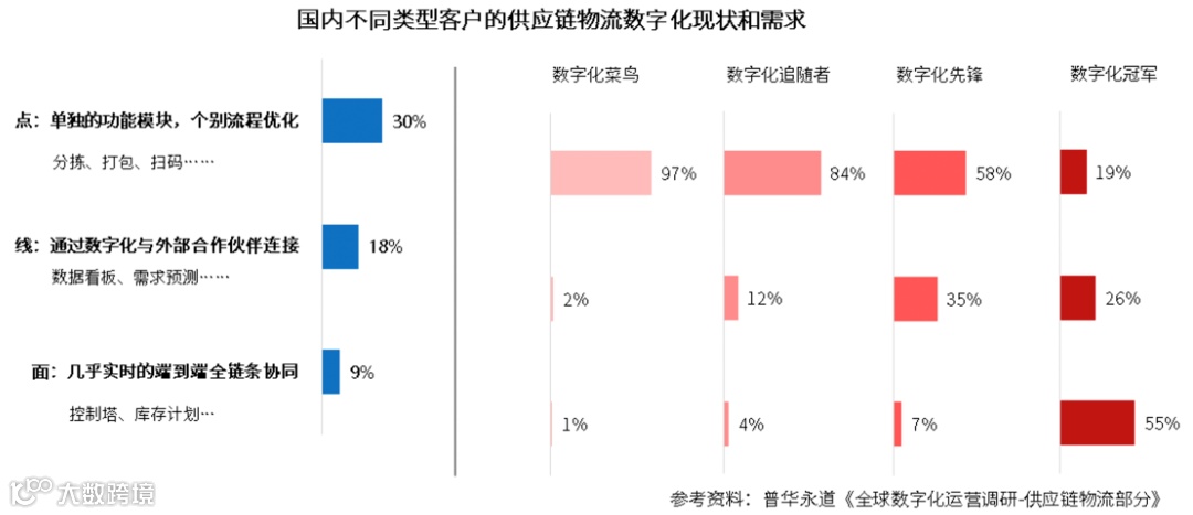 从以上数据可以看到,在仓储、运输、配送,以及仓配衔接、供应链网络等企业供应链数字化场景落地中,不同类型企业都不同程度地存在信息流、商流、物流的错位错配的“黑箱”现象。例如: