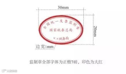 新启用的发票监制章形状为椭圆型,长轴为3厘米,短轴为2厘米,边宽为0.1厘米,内环加刻一细线,上环刻制“全国统一发票监制章”字样,中间刻制“国家税务总局”字样,下环刻制“××省(区、市)税务局”字样,下环字样例如:“上海市税务局”。字体为楷体7磅,印色为大红色。