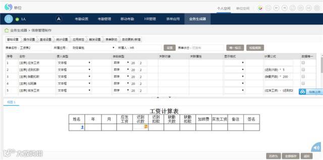 系统同步数据后,C1自动将月出勤的各项汇总数据传入到业务生成器中。业务生成器可通过这张接口数据底表对考勤数据进行二次加工和相关引用。