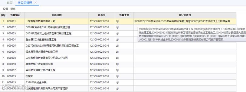 首先通过“多公司设置”建设各地项目的独立核算,资金由总公司集中管理,且每个项目配一名财务人员,总公司为各地项目建立11套独账,通过启用“多公司管理”之后,多个项目账务实现集中核算。