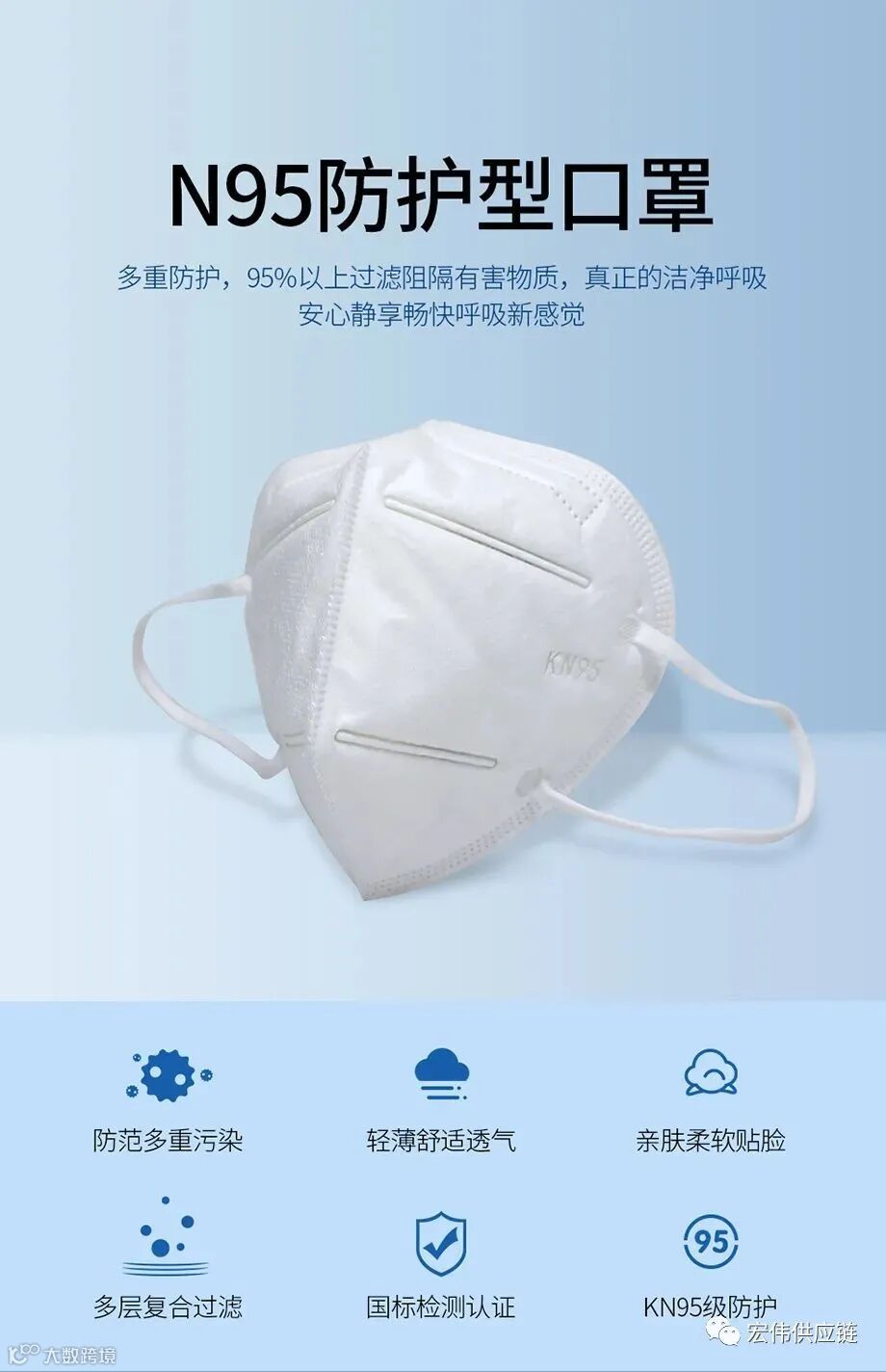 N95口罩多层防护,在提供轻薄舒适的轻柔佩戴感的同时,阻挡过滤95%以上的有害物质。