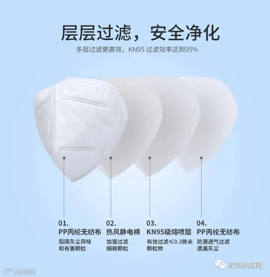 这里推荐的是一款海固产业园生产的N95口罩。设计有4层防护过滤,一层设计阻隔灰尘异味和有害颗粒;二层设计加强过滤细微颗粒;三层设计过滤≤0.3微米的颗粒物;四层设计再度防护,阻拦遗漏的灰尘颗粒。