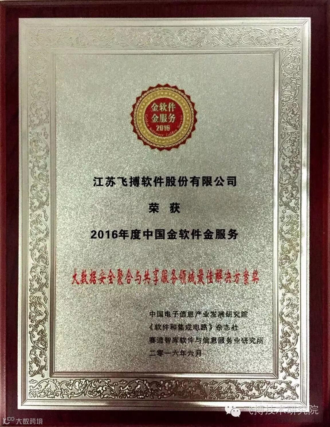 近日“2016中国方案商大会暨(第十八届)金软件金服务调查评选活动”传来喜讯,江苏飞搏软件股份有限公司(简称飞搏软件,NEEQ:834787)荣获“2016年度金软件金服务大数据安全聚合与共享服务领域最佳解决方案奖”。