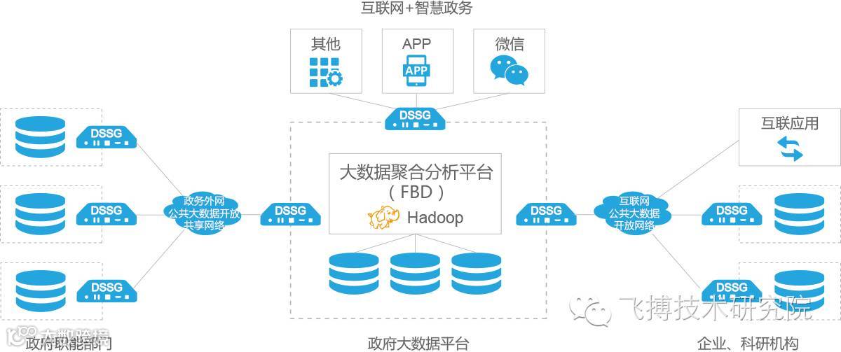 飞搏数据安全服务网关DSSG部署于政务职能部门业务数据源侧,通过政务网实现互联;部署于企业、机构、社会组织等各类数据源侧,通过互联网实现互联,形成公共大数据安全开放与共享网络。