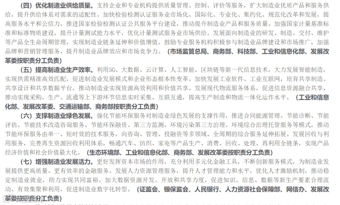 《意见》主要围绕推动制造服务业高质量发展,从四大方面提出了24条细则,其中包括推动制造业供应链创新应用、融合发展试点示范行动等。