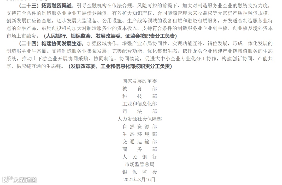 此外,《意见》还指出要充分利用多元化金融工具、支持科技企业与高校及科研机构等展开合作、支持制造业企业剥离非核心服务、为产业链上下游企业提供专业化服务、实施中小企业数字化赋能专项行动、推进“5G+工业互联网”512工程等等,凸显了发改委、教育部、科技部、工信部、人民银行、银保监会等13部门在考量上的全面性、创新性和前瞻性,为制造服务业的发展提供了多维度的方向和路径。