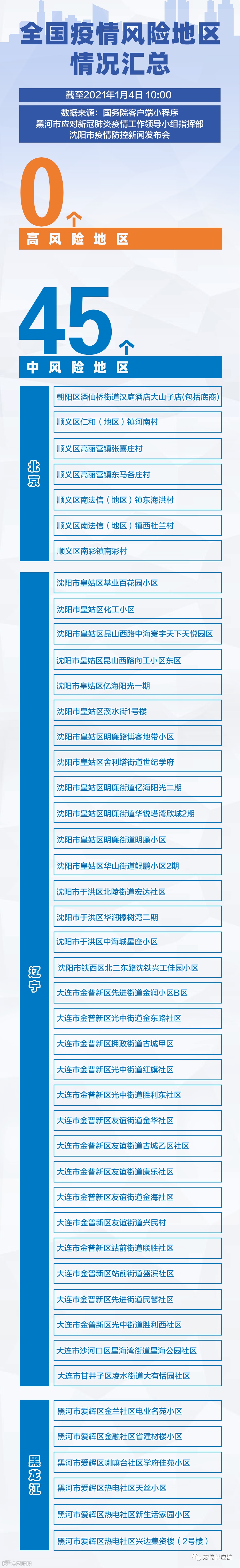 截至2021年1月4日10时,全国共有45个地区,调整为中风险地区:
