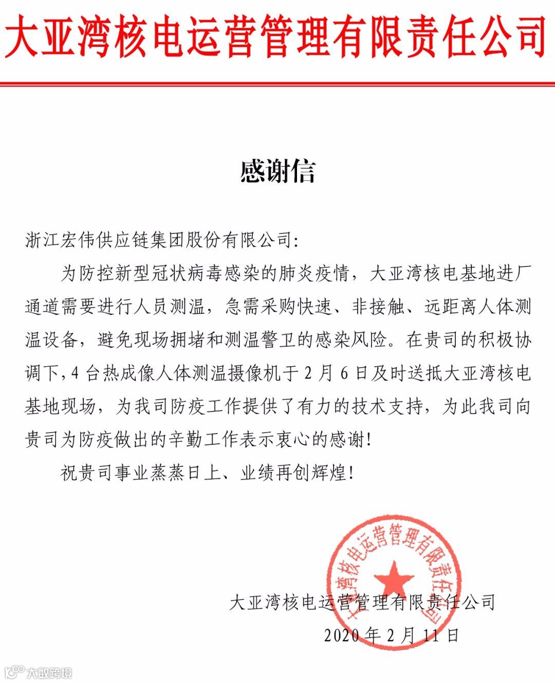 “在贵司的积极协调下,4台热成像人体测温摄像机于2月6日及时送达大亚湾核电基地现场,为我司防疫工作提供了有力的技术支持,为此,向贵司为防疫做出的辛勤工作表示衷心感谢”。近日,一封来自大亚湾核电运营管理有限责任公司的感谢信,让宏伟人在这场令人焦灼不安的疫情里感到倍加温暖。参与到本次人体测温系统调度的每位宏伟人都切身体会到了与宏伟家人、与客户之间默契联动,以及并肩奋战的凝合力。在此十分感谢中核二三南方分公司鼎力相助。