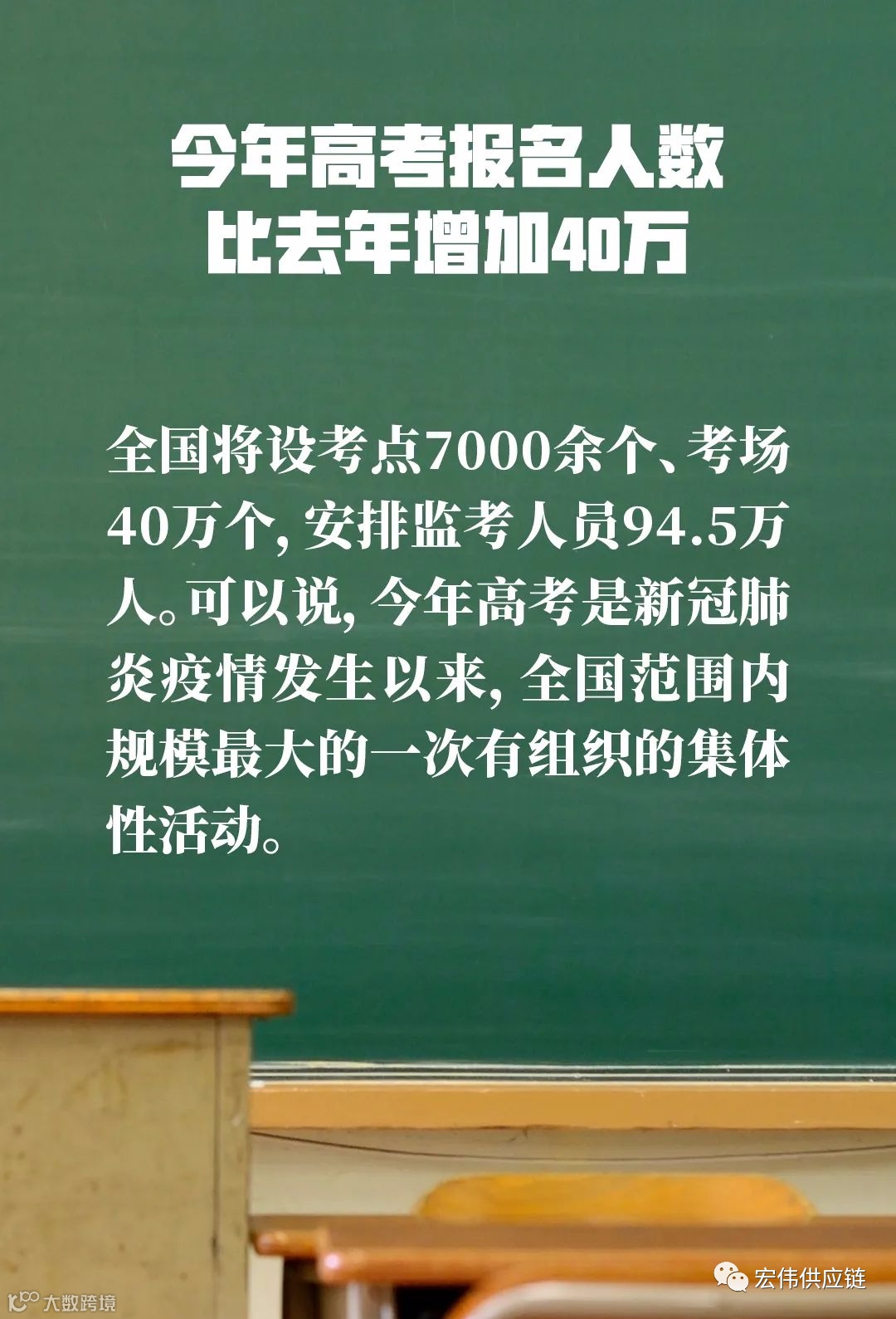 据了解,今年高考报名人数为1071万人,比去年增加40万。全国将设7000余个考点、40万个考场,安排监考人员94.5万人。今年高考是疫情发生以来,全国范围内规模最大的一次有组织的集体性活动。