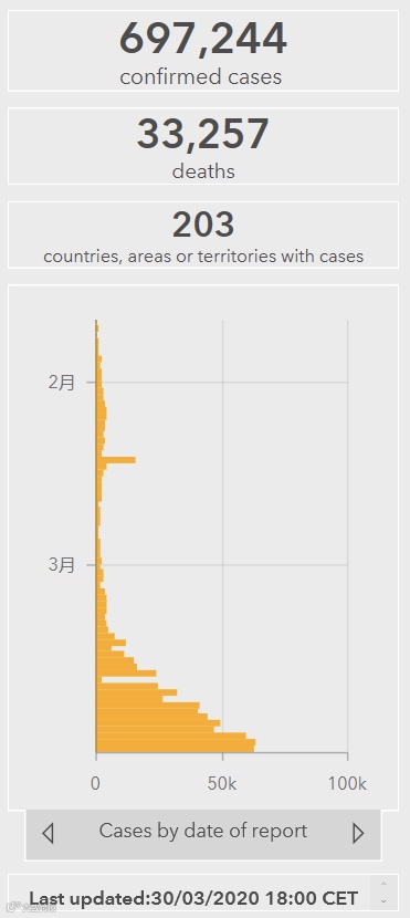 世卫组织实时统计数据显示,截至欧洲中部时间3月30日18时(北京时间3月31日0时),全球确诊新冠肺炎697244例,死亡33257例,目前全球已有203个国家地区出现新冠肺炎。