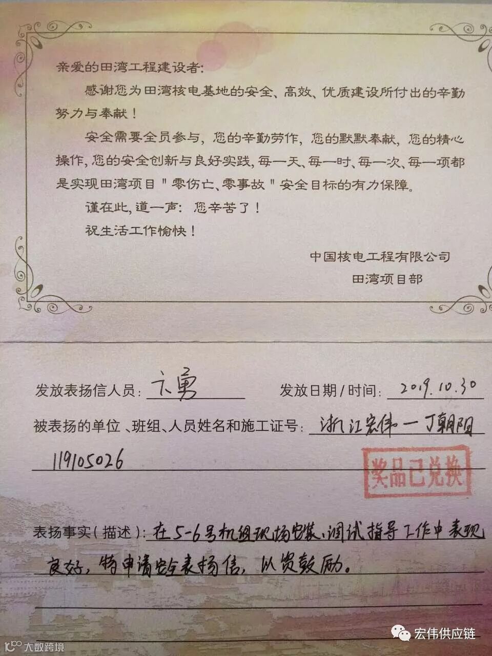 近日,宏伟供应链集团收到了来自中核工程公司田湾项目部的表扬信,对我司田湾项目电梯安装团队在田湾电梯5-6号机组现场安装、调试工作中做出的努力给予了表扬和鼓励。