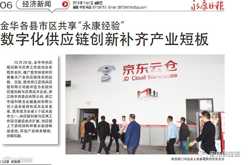 10月29日,金华市供应链创新与应用工作现场会在我市召开,推广我市探索和完善重点产业供应链体系的经验。目前,我市浙江宏伟供应链有限公司被评选为全国供应链创新与应用试点企业,浙江伟丰肉食品有限公司、浙江中国科技五金城集团有限公司入选全省首批试点企业名单,我市成为全省5个试点县市之一,供应链创新与应用工作项目建设由点扩面,供应链上下游的协同和整合取得明显成效,实现产业降本增效、供需匹配。