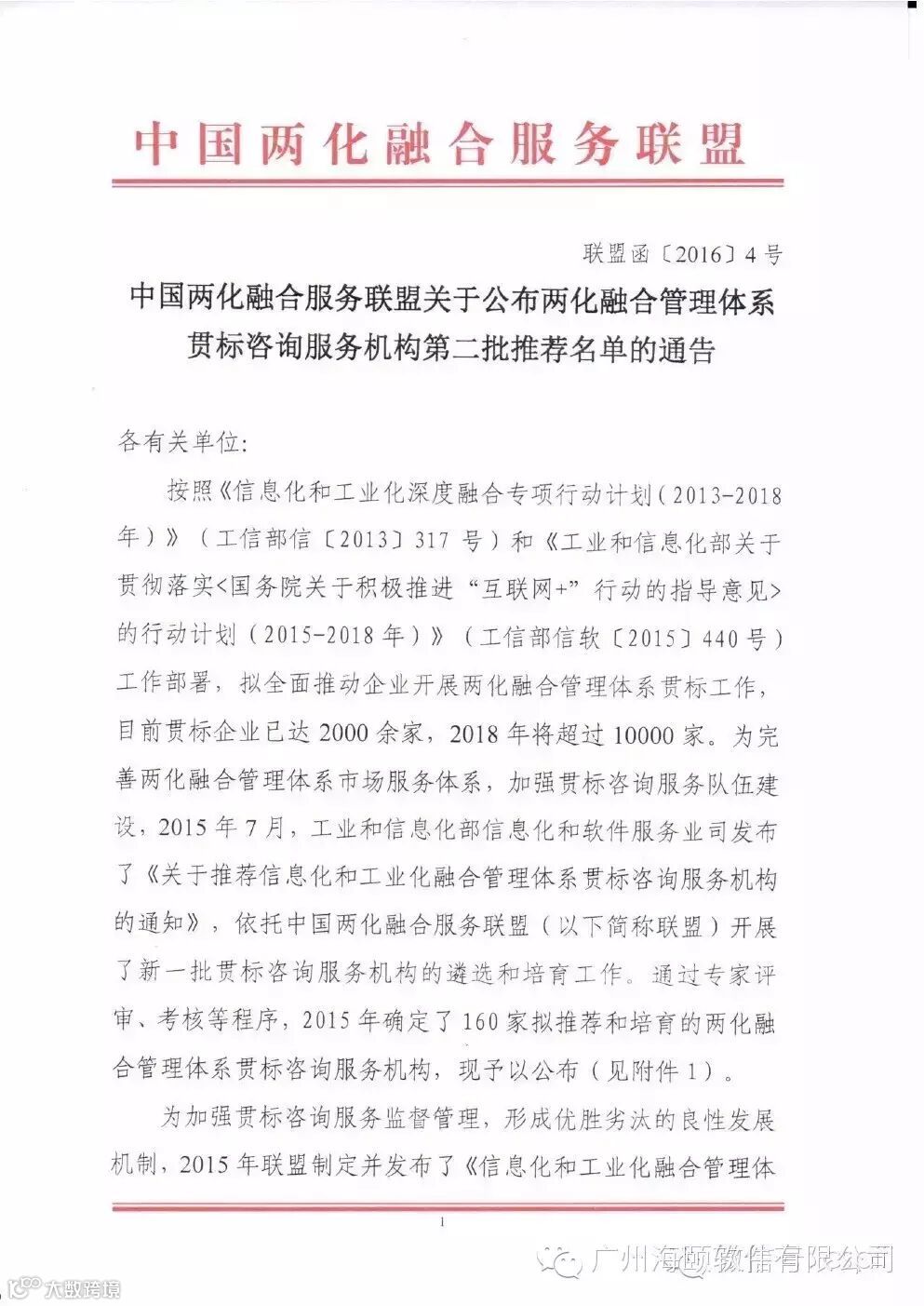 导读:联盟函〔2016〕4号中国两化融合服务联盟关于公布两化融合管理体系贯标咨询服务机构第二批推荐名单的通告