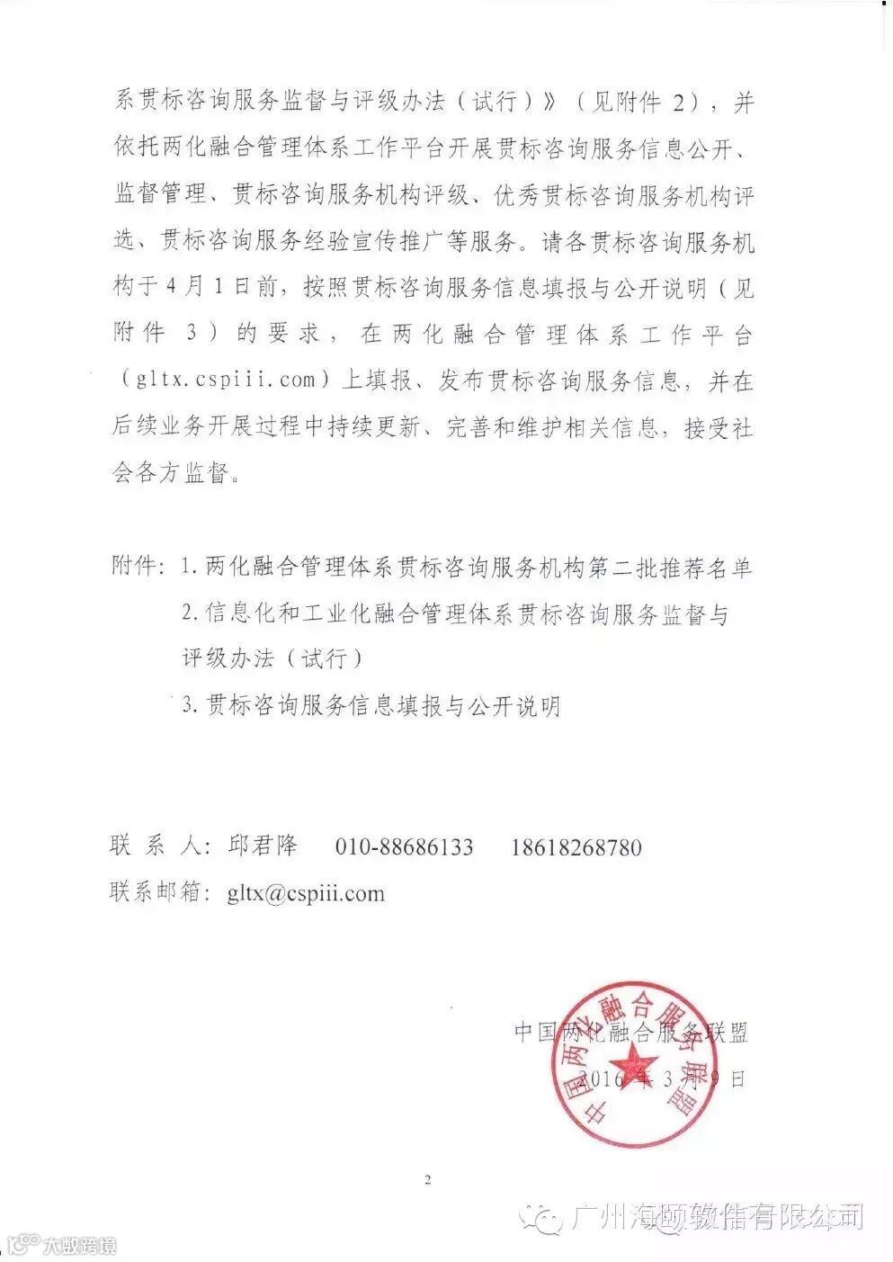 关于公布两化融合管理体系贯标咨询服务机构第二批推荐名单的通告