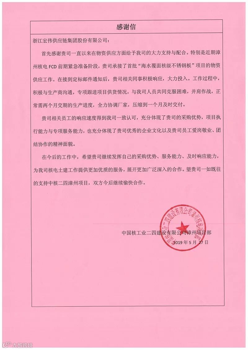 近日,宏伟供应链集团收到了来自中国核工业二四建设有限公司漳州项目部的感谢信,对公司服务于该项目的员工在漳州核电FCD 前期准备阶段“海水覆面核级不锈钢板”项目的物资供应工作中做出的努力给予充分认可和高度赞誉。