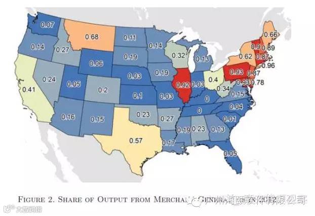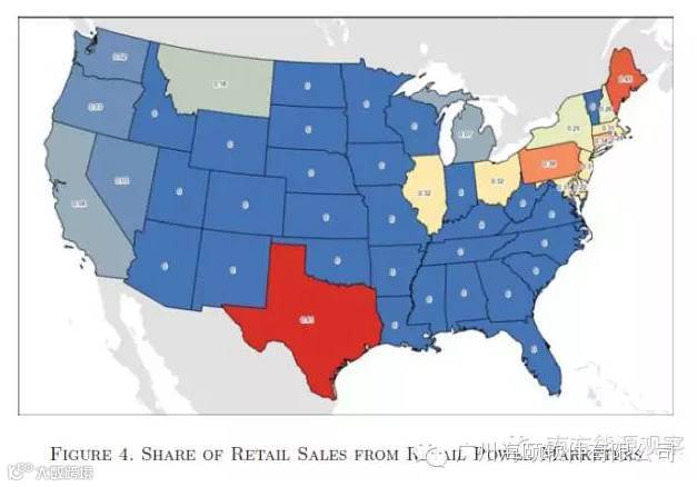 零售端改革的具体实施情况在每个州的情况都有很大的差别,图4展现了在每个州内第三方零售商在零售市场内的占有比例。显然德克萨斯州在零售市场竞争方面已远远超过其他地区,除此之外,只有东北部一带还有相对活跃的零售市场。